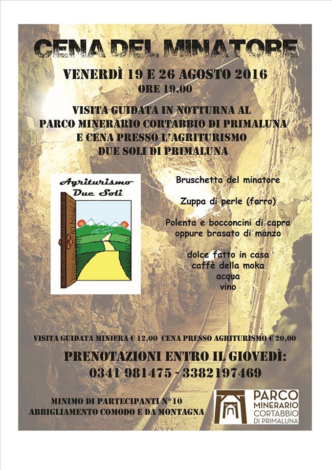 L’Agriturismo Due Soli di Primaluna, in collaborazione con le miniere di Cortabbio di Primaluna, propone per le serate di venerdì 21 e 28  agosto dalle ore 19.00 la visita guidata notturna alle miniere con, a seguire, “la cena del minatore” in agriturismo.