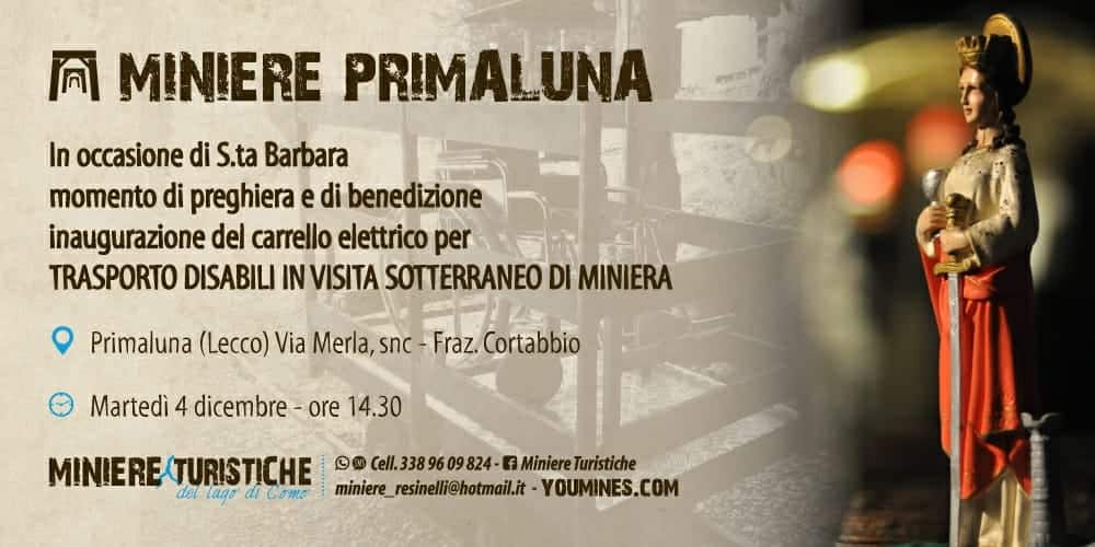 In occasione di Santa Barbara, le Miniere Turistiche di Cortabbio inaugurano il nuovo carrello elettrico adibito al trasporto dei disabili che volessero visitare le miniere. L’evento è previsto per il giorno martedì 4 dicembre dalle ore 14.30, con un momento di preghiera e di benedizione seguito da una visita dimostrativa per disabili prevista alle ore 15.30, mentre alle ore 16.30 visita guidata per persone abili per un gruppo massimo di 30 persone. Per questo è necessaria la prenotazione.