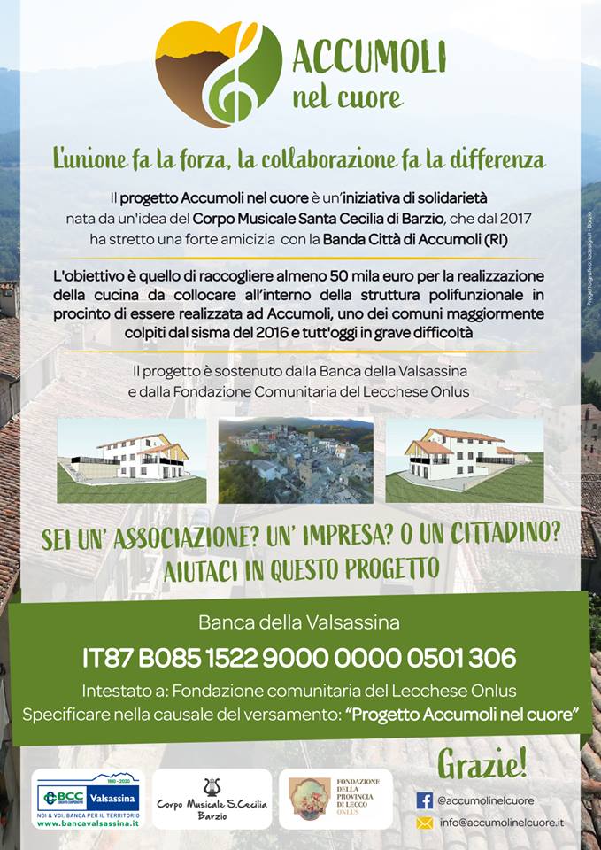 Nata dall’amicizia fra il Corpo Musicale Santa Cecilia di Barzio e la Banda Città di Accumoli, è oggi sostenuta dalla Banca della Valsassina e dalla Fondazione Comunitaria del Lecchese Onlus.