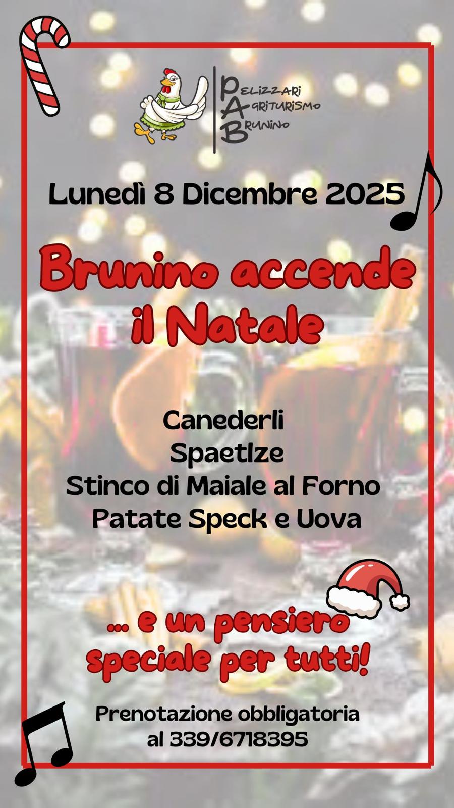 Lunedì 8 dicembre 2025 l’AgriturismoBrunino dà ufficialmente il via alle feste con l’evento “Brunino accende il Natale”: una serata speciale all’insegna dei sapori autentici e dell’atmosfera natalizia.