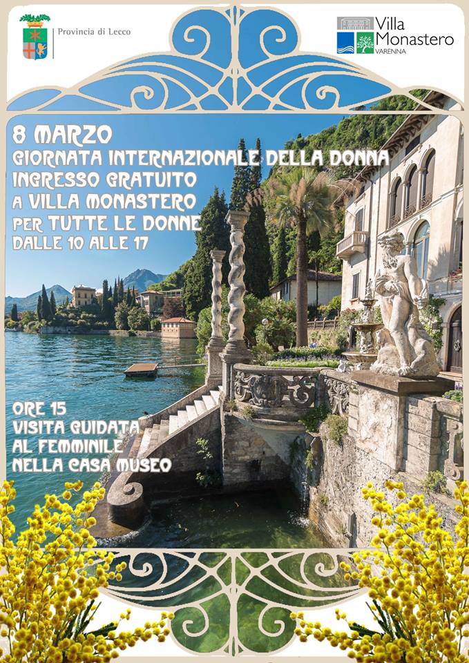 Giovedì 8 marzo, in occasione della Festa della Donna, viene proposto a tutte le donne l’ingresso gratuito a Villa Monastero dalle ore 10 alle ore 17. Alle ore 15 poi viene organizzata una visita guidata alla Casa Museo.