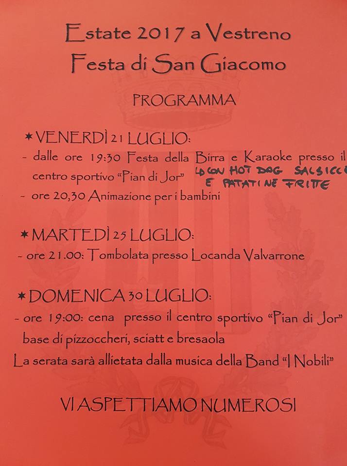 - Domenica 30 luglio: alle 19 cena a base di pizzoccheri, sciatt e bresaola, presso il Centro Sportivo “Pian di Jor”, e a seguire musica con la band “I nobili”.
