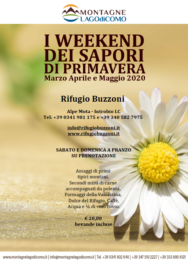 Il Rifugio Buzzoni presso l’Alpe Mota a Introbio, in occasione dell’evento gastronomico “I Weekend dei Sapori di Primavera sulle Montagne del Lago di Como“, propone un gustoso menù a base di piatti tipici primaverili del territorio, da gustare nei mesi di marzo, aprile e maggio.