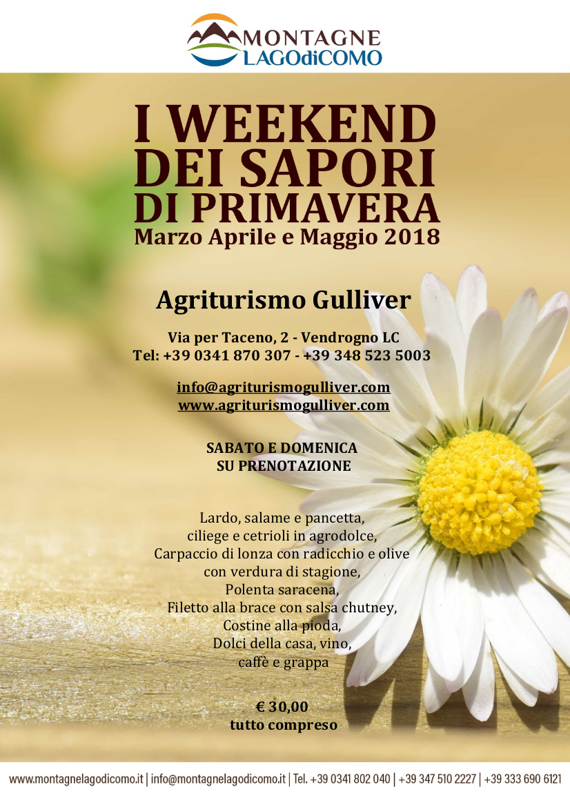 L’ Agriturismo Gulliver di Vendrogno in occasione dell’evento gastronomico “I Weekend dei Sapori di Primavera sulle Montagne del Lago di Como“, propone un gustoso menù a base di piatti tipici primaverili del territorio, da gustare nei mesi di marzo, aprile e maggio.