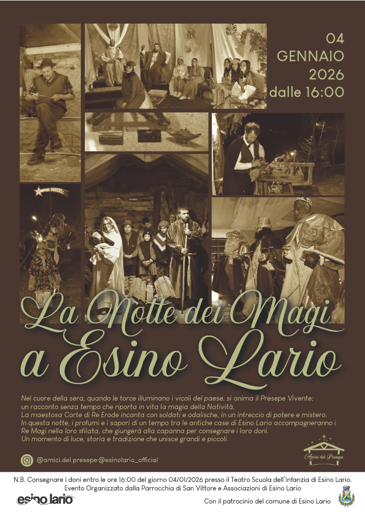 La Notte dei Magi è un evento suggestivo che ogni anno anima il borgo di Esino Lario, trasformandolo in un grande presepe vivente. Al calare della sera, i vicoli del paese si illuminano di torce e luci soffuse, facendo rivivere atmosfere antiche e scene di vita quotidiana ispirate alla tradizione della Natività.