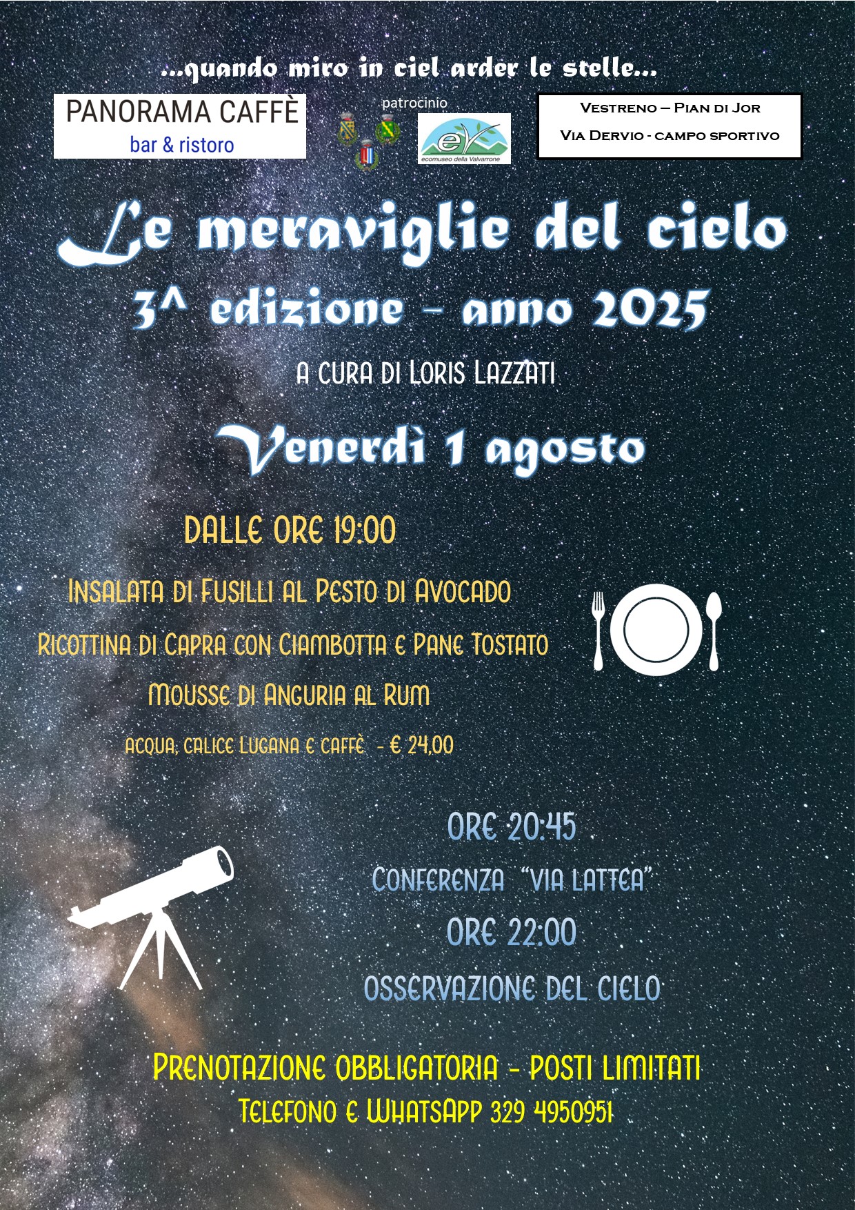 Presso il Panorama Caffè di Vestreno, torna per la terza edizione il ciclo di incontri ‘Le meraviglie del cielo’: venerdì 1 agosto, il terzo appuntamento ci parlerà della Via Lattea.