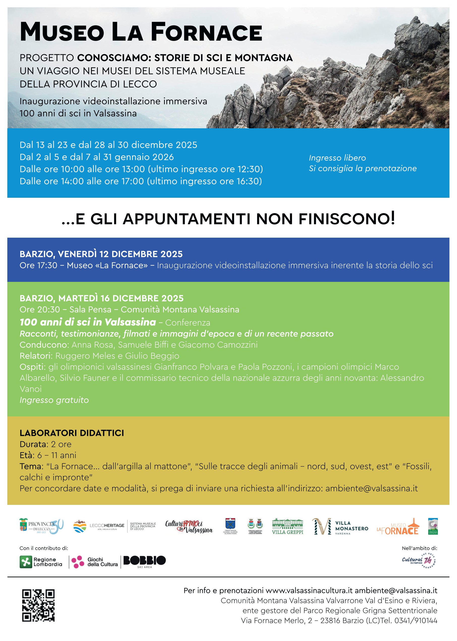 Il Sistema Museale della Provincia di Lecco presenta un nuovo percorso immersivo dedicato alla storia dello sci in Valsassina. Presso il Museo La Fornace, infatti, viene inaugurata la videoinstallazione “100 anni di sci in Valsassina”, un viaggio tra immagini, memorie e paesaggi che raccontano un secolo di sport e cultura alpina.