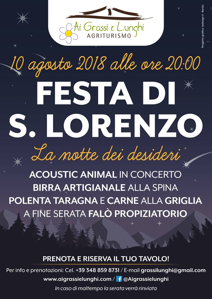 L’Agriturismo Ai Grassi e Ai Lunghi di Pasturo organizza per la notte di San Lorenzo una serata in compagnia con la musica degli “Acoustic Animals” con possibilità di cena con polenta taragna e carne alla griglia.