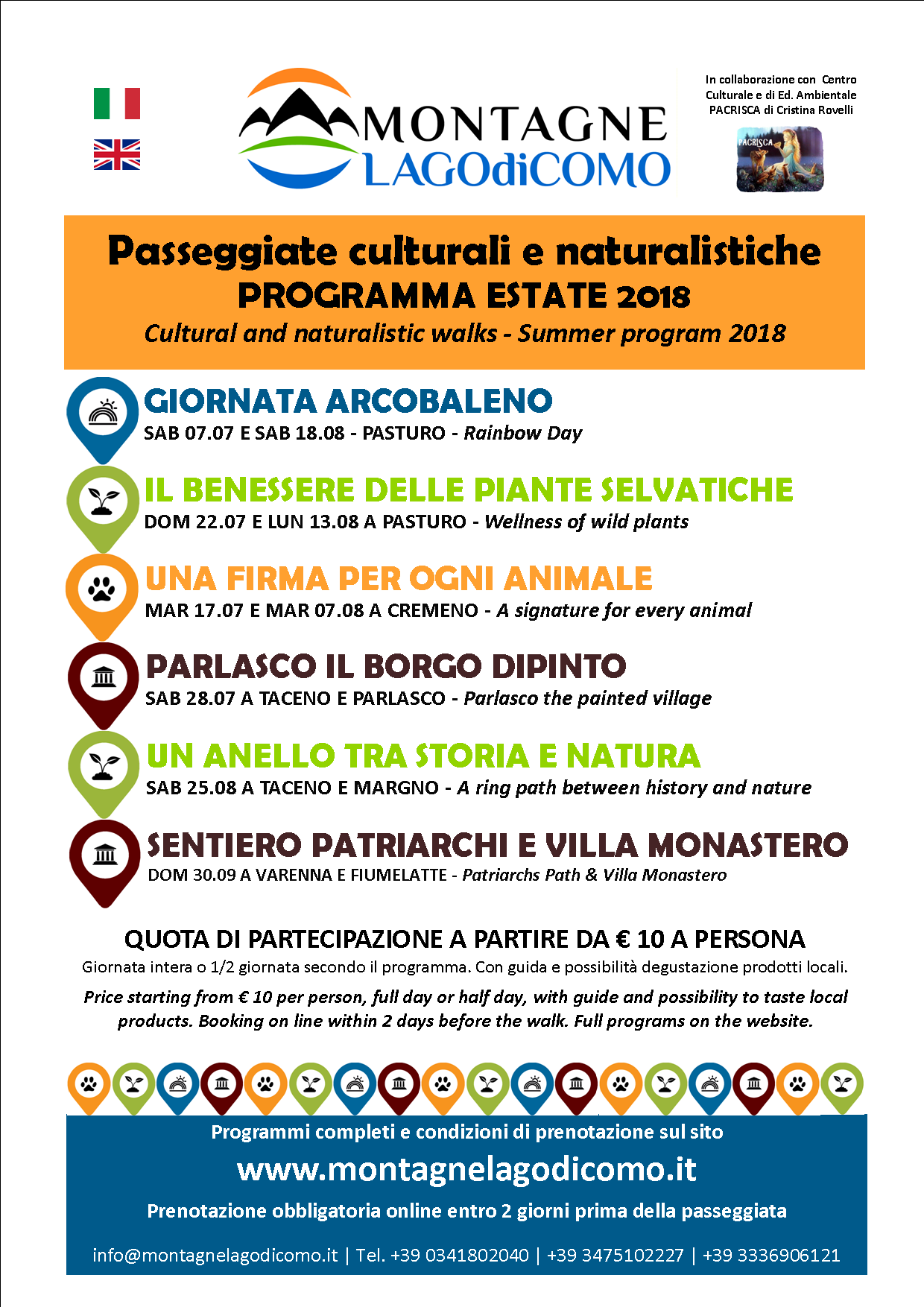Nell’ambito del programma di Passeggiate Culturali e Naturalistiche dell’Estate 2018, Montagne del Lago di Como propone in collaborazione con il Centro Culturale e di Educazione Ambientale PACRISCA di Cristina Rovelli