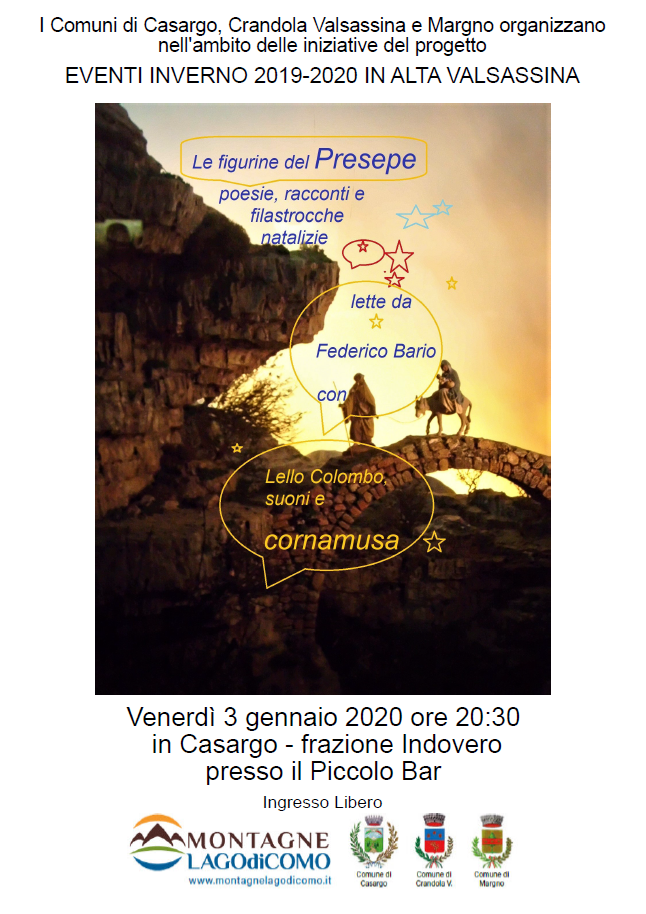 Nell’ambito degli appuntamenti invernali Eventi Alta Valsassina Inverno 2019/2020 organizzati dai comuni di Casargo, Crandola Valsassina e Margno, viene organizzato una serata culturale con musica dal titolo”Racconti di Natale”